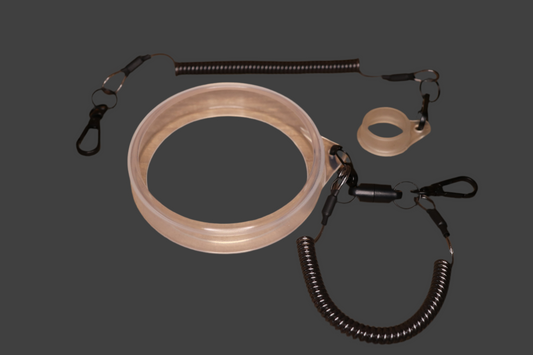 Quality add-ons to the tether system consist of black split rings as well as black mini carabiner for connection to sleeve.